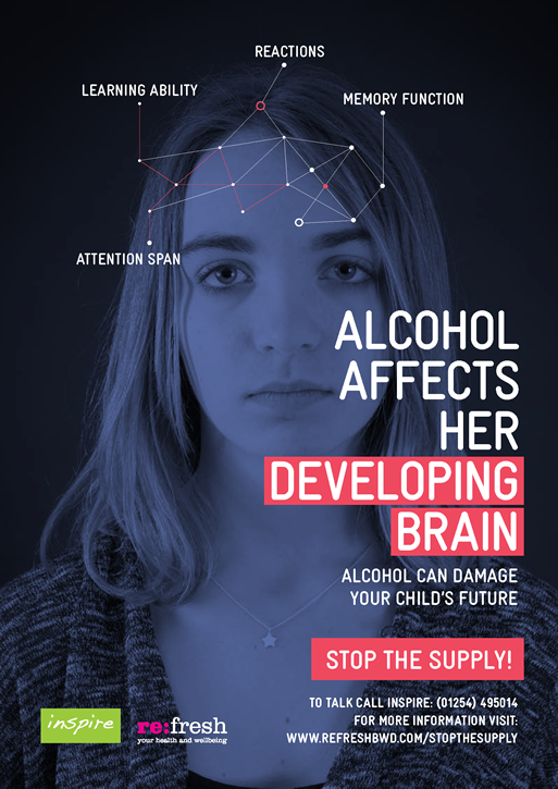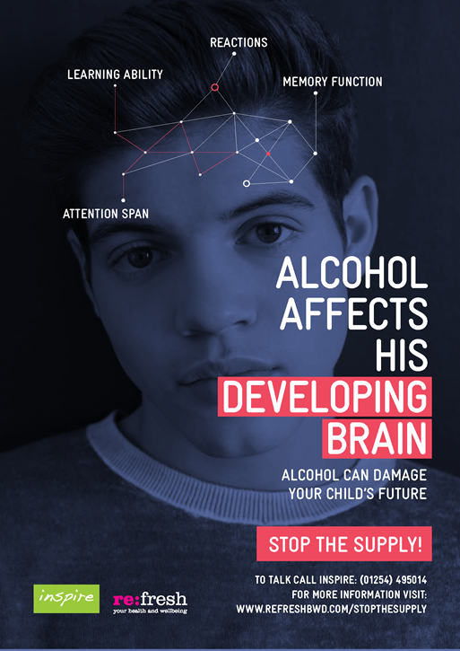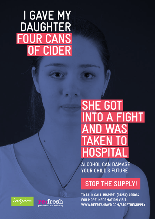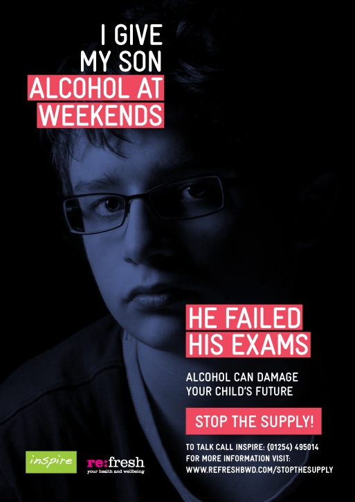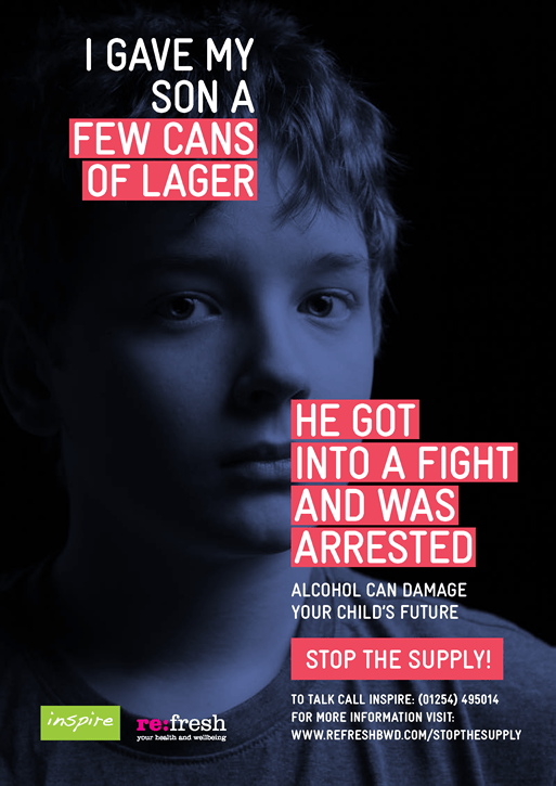 The online digital and printed poster campaign urges parents to ‘Stop the Supply’ of alcohol to children aged 13-16, highlighting various ways in which it can damage a young person’s future. In designing Stop The Supply, parents from across Blackburn with Darwen were spoken to, to gauge their awareness of and attitudes towards giving alcohol to their children at a young age. These conversations helped to inform the campaign’s visuals and typical circumstances when alcohol might be given by parents to their children.