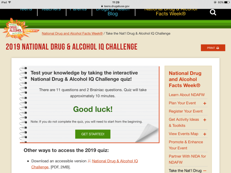 National Drug and Alcohol Facts Week® links students with scientists and other experts to counteract the myths about drugs and alcohol that teens get from the internet, social media, TV, movies, music, or from friends. It was launched in 2010 by scientists at the National Institute on Drug Abuse (NIDA) to stimulate educational events in communities so teens can learn what science has taught us about drug use and addiction. The National Institute of Alcohol Abuse and Alcoholism became a partner in 2016, and alcohol has been added as a topic area for the week. NIDA and NIAAA are part of the National Institutes of Health.”