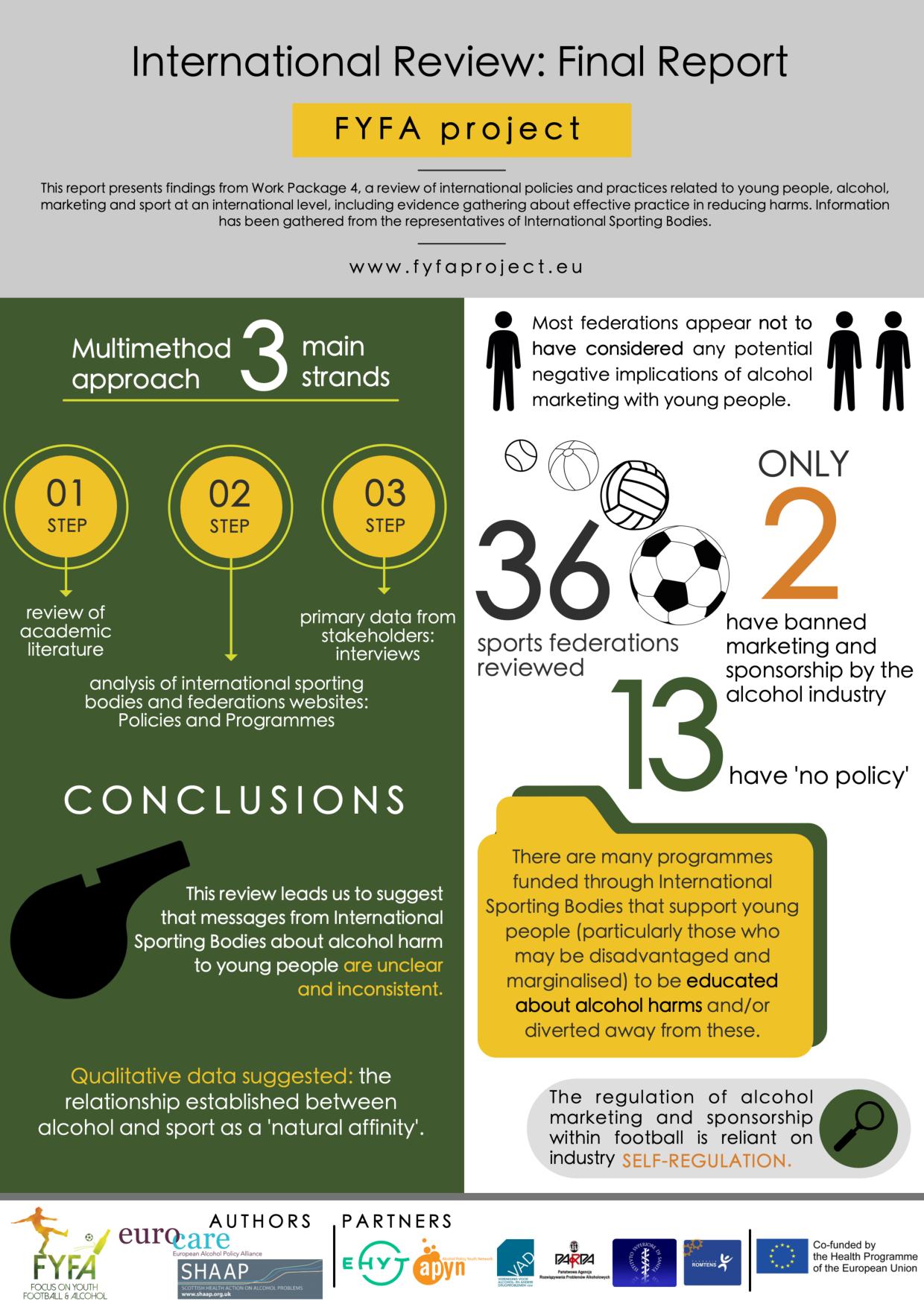 “An international review of polices relating to young people, alcohol, marketing and sports is the main deliverable of Work Package 4 of the FYFA project. The review was led by Scottish Health Action on Alcohol Problems (SHAAP) and support given by the European Alcohol Policy Alliance (Eurocare).