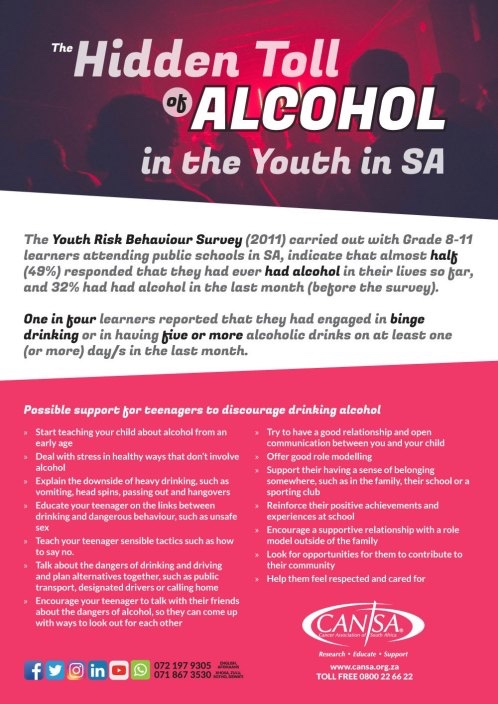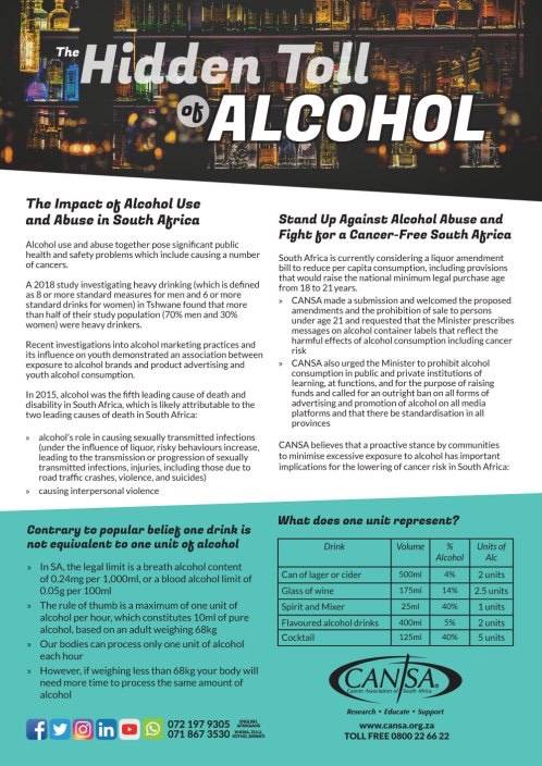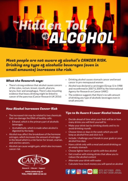 June 4, 2019 The Hidden Toll of Alcohol Infographics from the Cancer Association of South Africa (CANSA) Share this:TweetShare on TumblrLike Loading... Related
