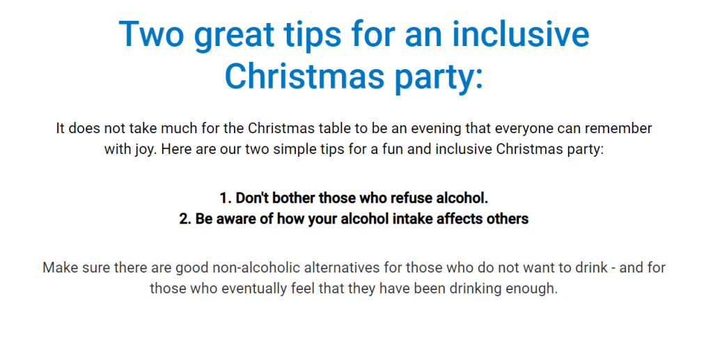 Be aware of how your own alcohol intake affects others and help all your colleagues have a positive experience from this year´s Christmas season.”