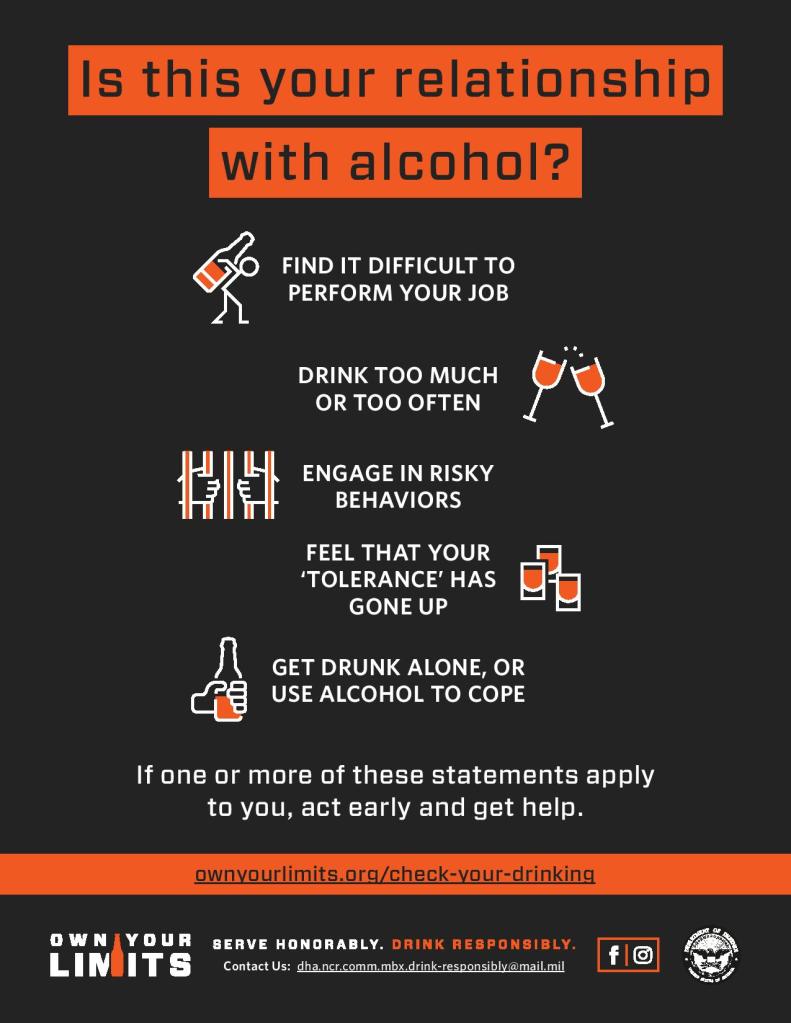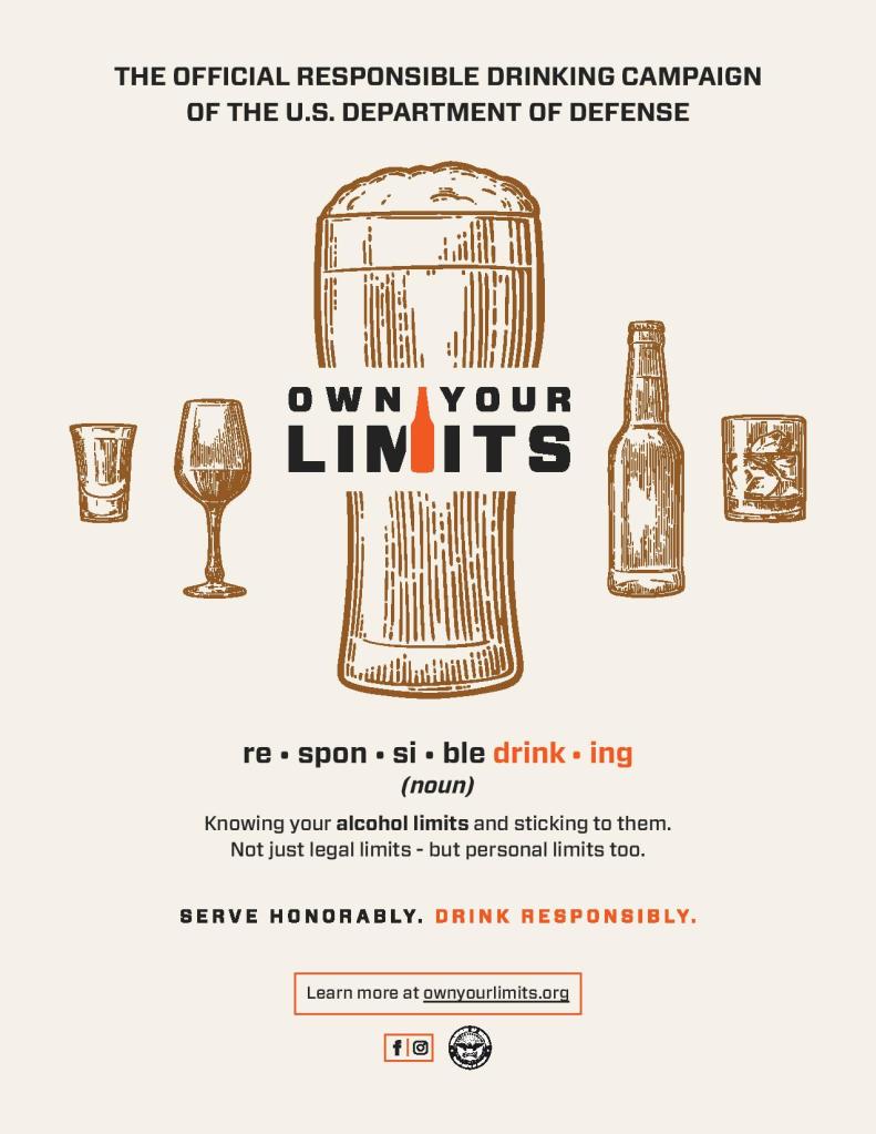 “Own Your Limits, a U.S. Department of Defense (DoD) program, is an educational campaign for the U.S. military. The mission of the campaign is to help Service members learn how to drink responsibly, if they choose to drink alcohol. The site supports the DoD’s efforts to build and sustain a ready and resilient force by providing resources and information to Service members so they can serve honorably and drink responsibly. Resources are also available for professionals who educate, support or work with Service members.”