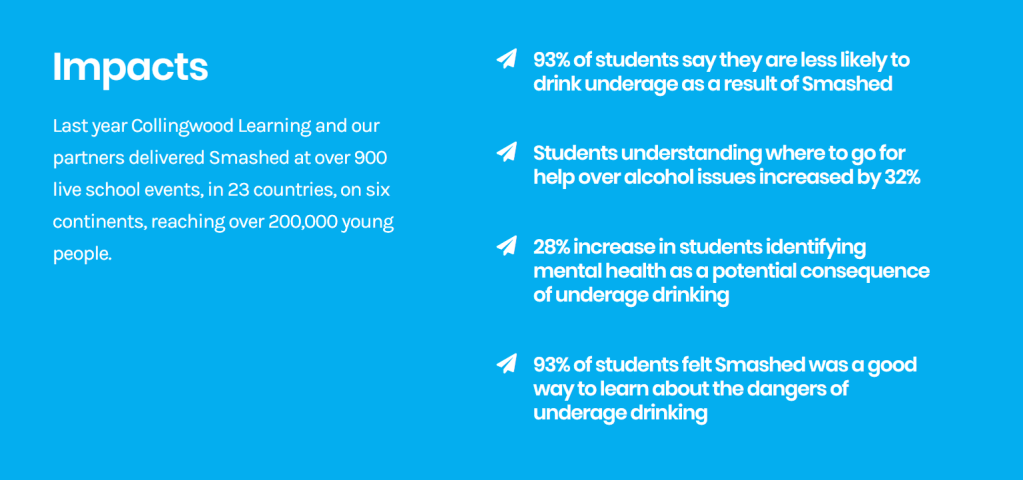 “Smashed is a global education programme by Collingwood Learning, educating young people on the dangers of underage drinking. Smashed is delivering behavioural and attitudinal change around the world, engaging young people in a uniquely creative way.”