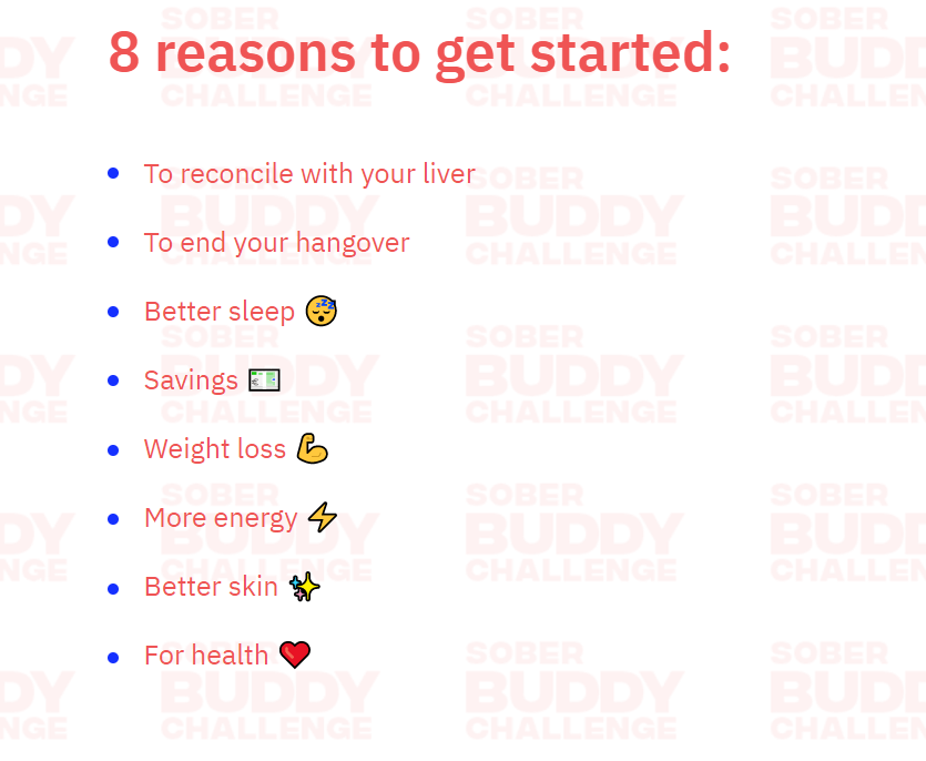 Similar to “Dry January”, the “Sober Buddy Challenge” is dedicated to not drinking alchohol for a month, with the support of a “buddy” (a close friend or a stranger); the mission is to succeed in the challenge together.