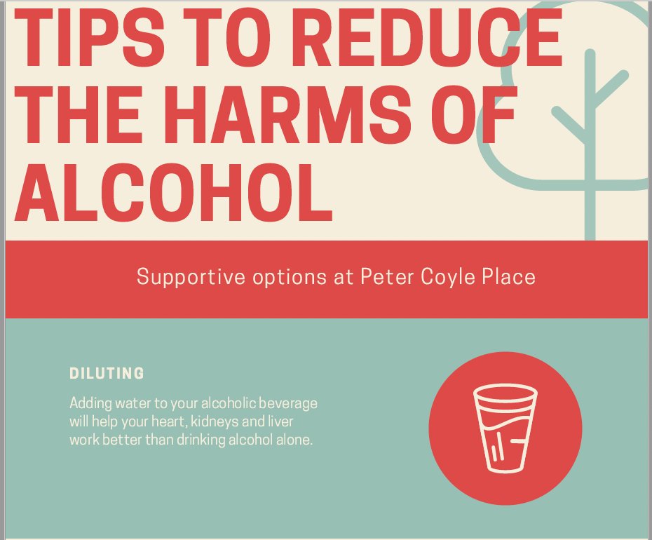 “Check out this infographic with helpful tips that our Health Equity Nurse, Emily Blair, gives to residents at Peter Coyle Place re: reducing harms while drinking alcohol.”