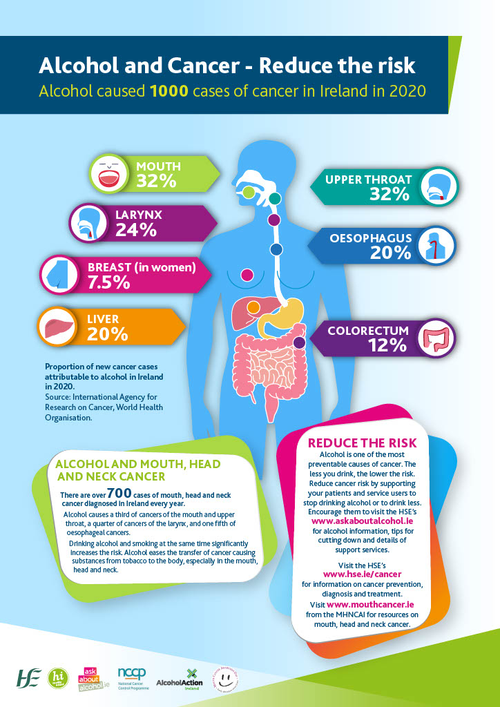 Alcohol increases the risk of head, neck and oesophageal (gullet) cancers.