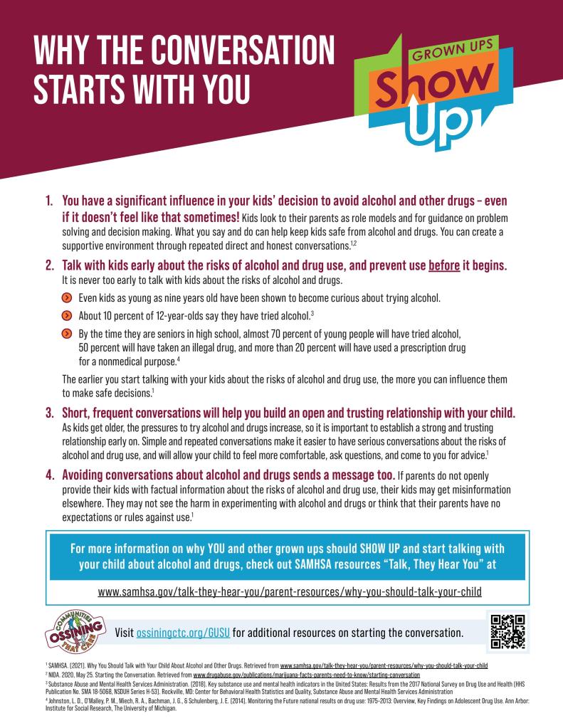 “We found that two out of every five middle and high school students in Ossining report never having conversations with their parents about alcohol and drugs,” said Alice Joselow, OCTC coordinator. “Grown Ups Show Up! is in direct response to that and gives parents and other adults the tools, tips, and supports they need to provide accurate, helpful information on ways to begin this important two-way dialogue with young people.”