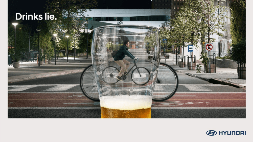“With the aim of raising awareness about the importance of not drinking alcohol when driving, Hyundai and Arena by Havas created the campaign “Alcohol lies”, made up of graphics that reflect the effect produced by drunk driving.”