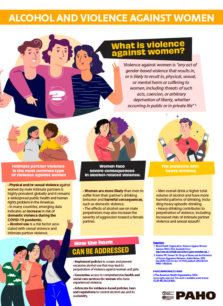 “This fact sheet presents definition and evidence on violence against women, including during the COVID-19 pandemic, and the harms caused by alcohol regarding the topic. Alcohol consumption is considered as risk factor associated with sexual violence and intimate partner violence.”