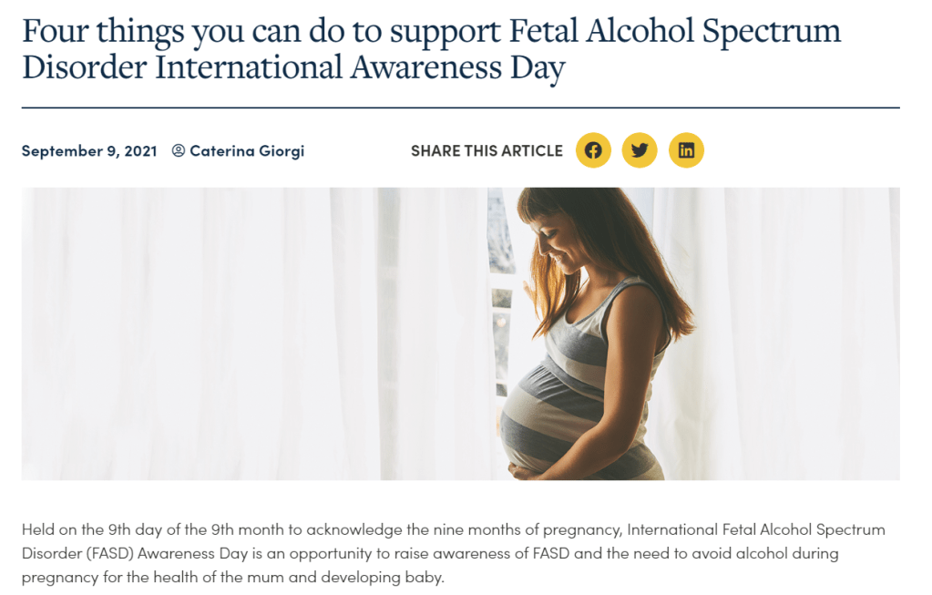 First celebrated in 1999, FASD day is devoted to raising awareness of fetal alcohol spectrum disorder (FASD) to improve prevention of FASD and diagnosis and support for individuals with FASD.