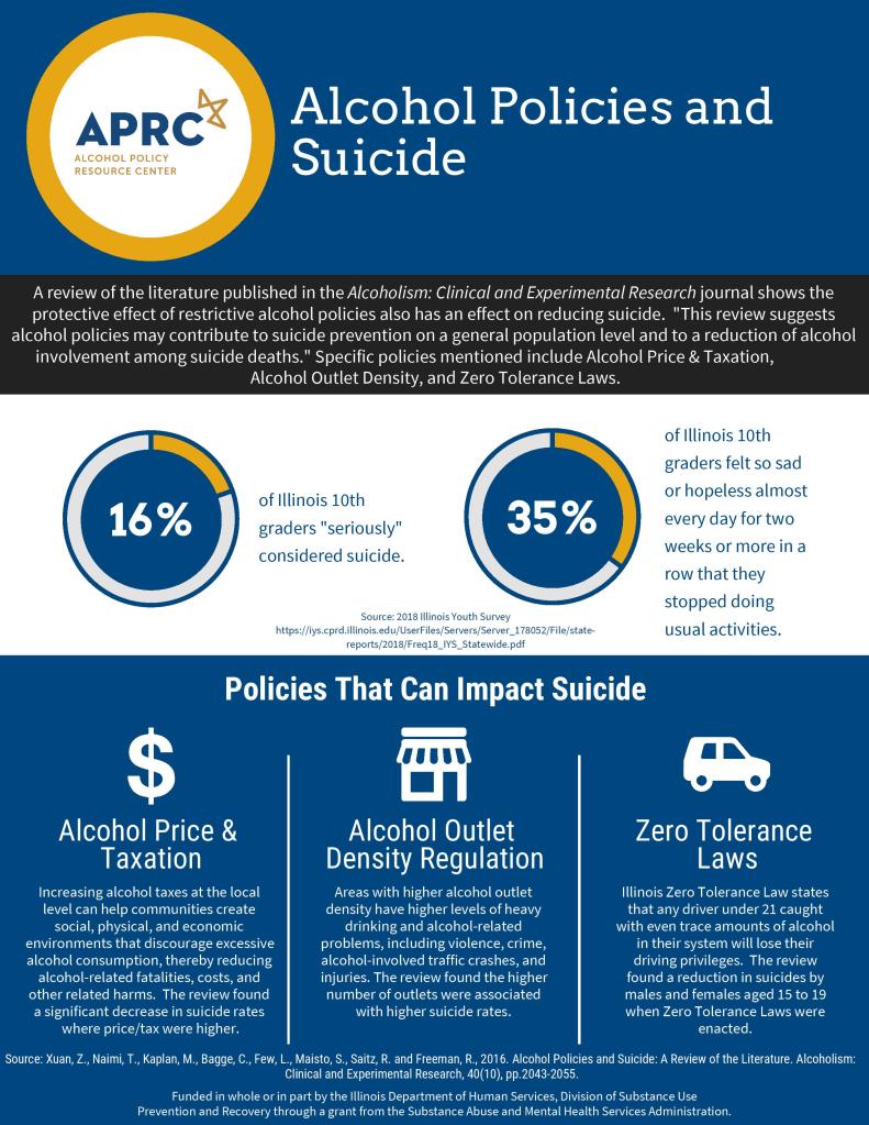 “A review of the literature published in the Alcoholism: Clinical and Experimental Research journal shows the protective effect of restrictive alcohol policies also has an effect on reducing suicide. “This review suggests alcohol policies may contribute to suicide prevention on a general population level and to a reduction of alcohol involvement among suicide deaths.” Specific policies mentioned include Alcohol Price & Taxation, Alcohol Outlet Density, and Zero Tolerance Laws.”