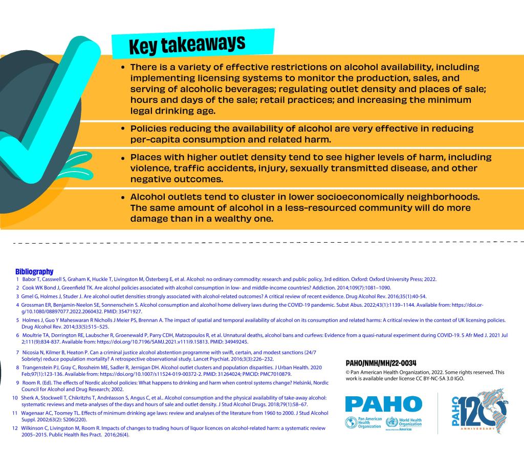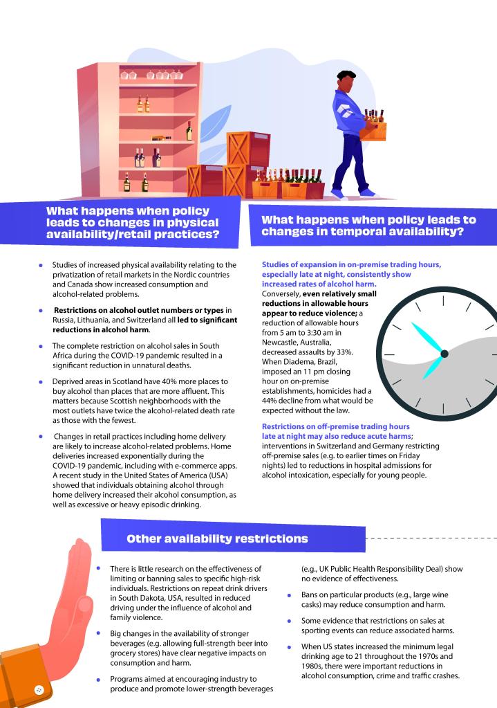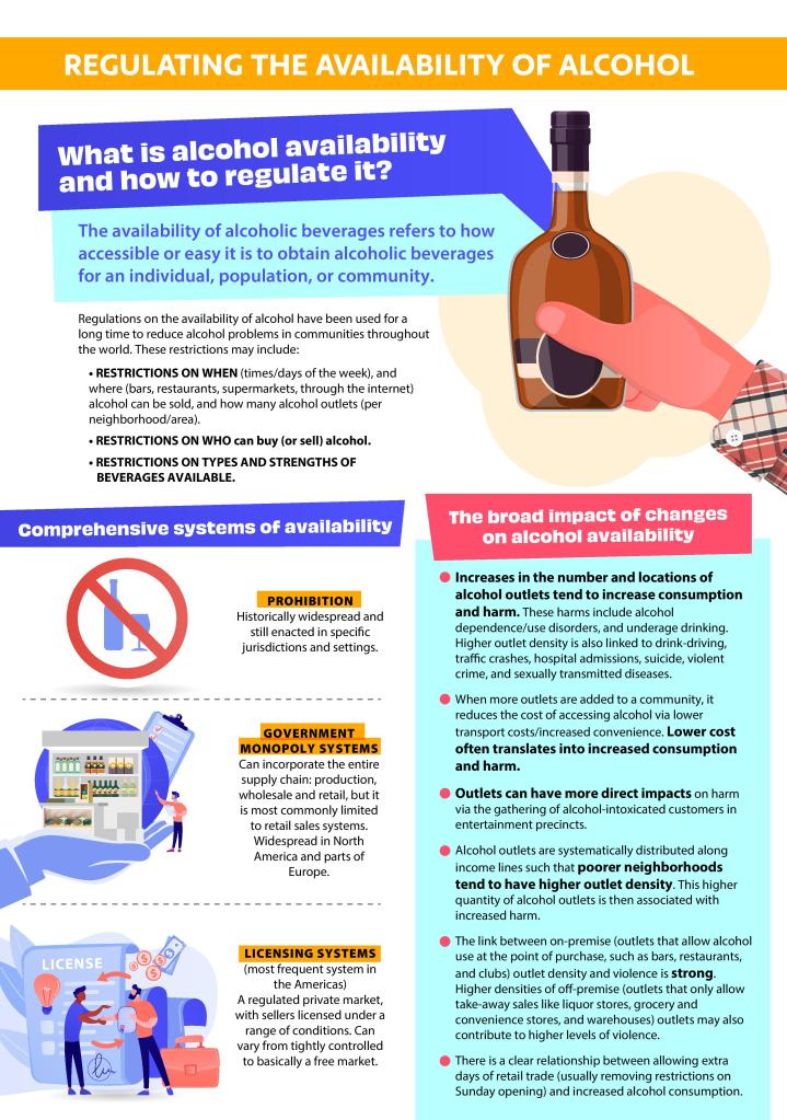 “Limiting the access to alcoholic beverages fall partially outside the health sector but they need to be implemented in order to reduce alcohol accessibility, leading to less alcohol consumption, harms, and therefore the health and social costs of alcohol. Despite the widespread use of licensing systems, they continue to be underused as a policy tool, and measures are only partially adopted and are not enforced.”