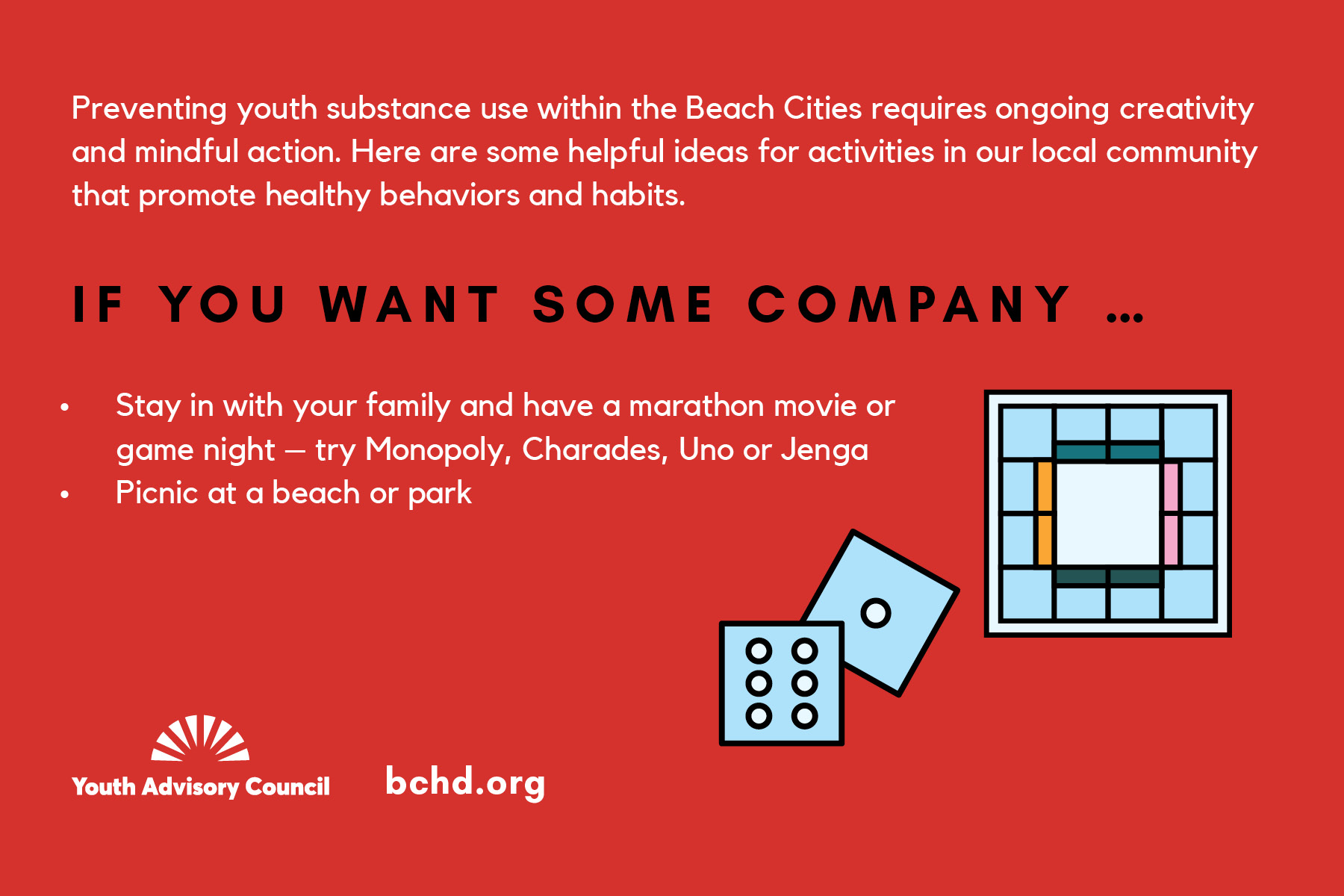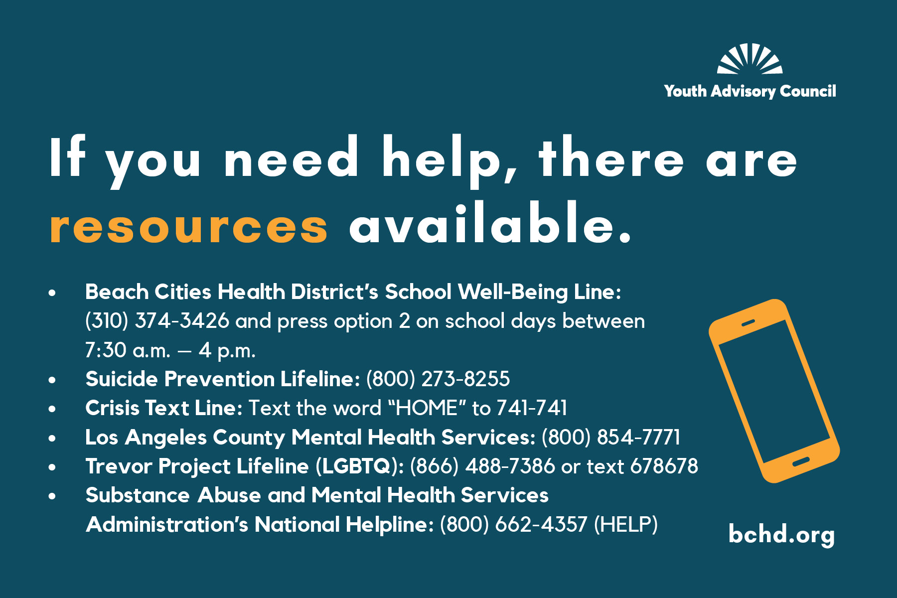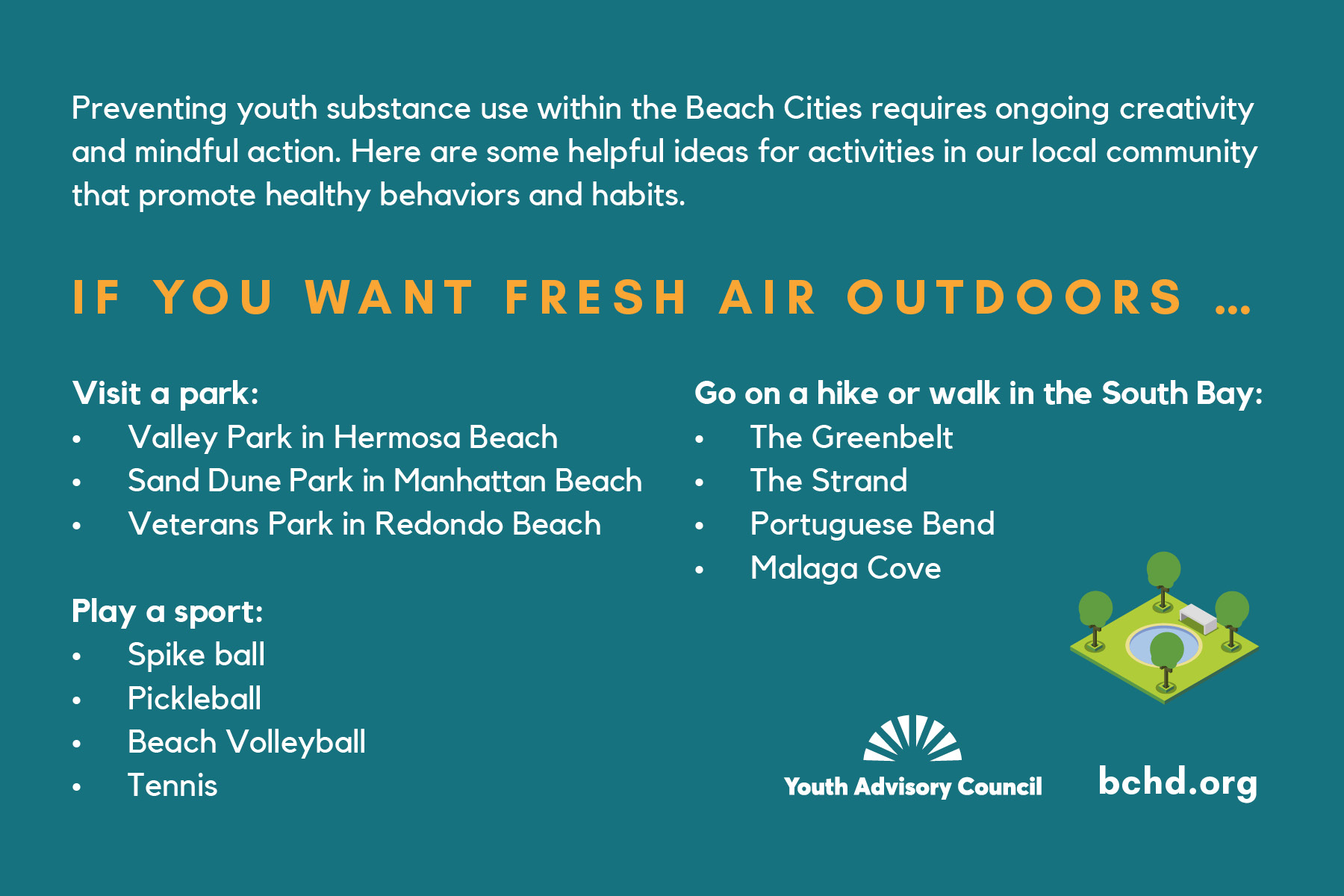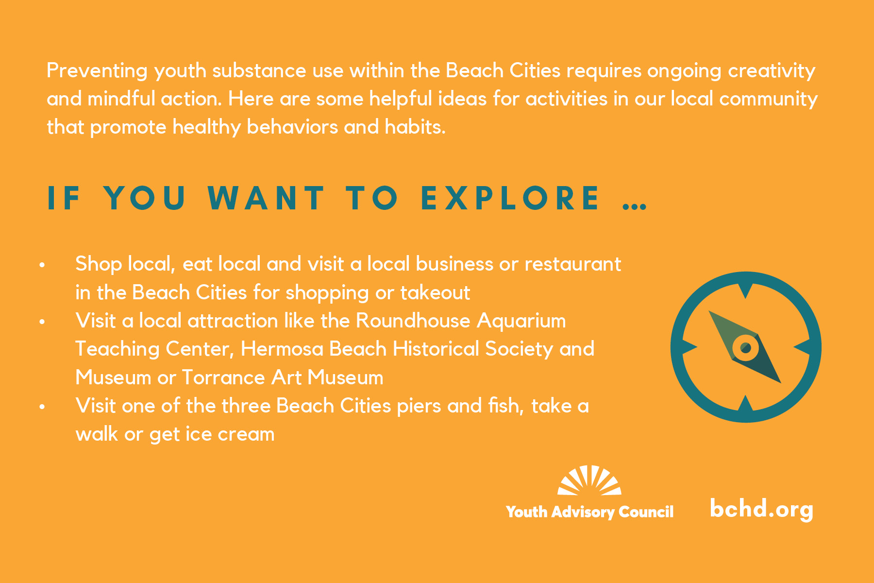 “BCHD’s Youth Advisory Council produced a PhotoVoice titled “Youth Perspectives of Alcohol Use in the Beach Cities.” The goal for this project was to highlight the youth voice and point of view on alcohol’s impact on the well-being of their local community. Students compiled photos, testimonials from peers, statistics and relevant research to develop a presentation explaining how the home environment and easy accessibility contribute to widespread alcohol use by youth in the Beach Cities.