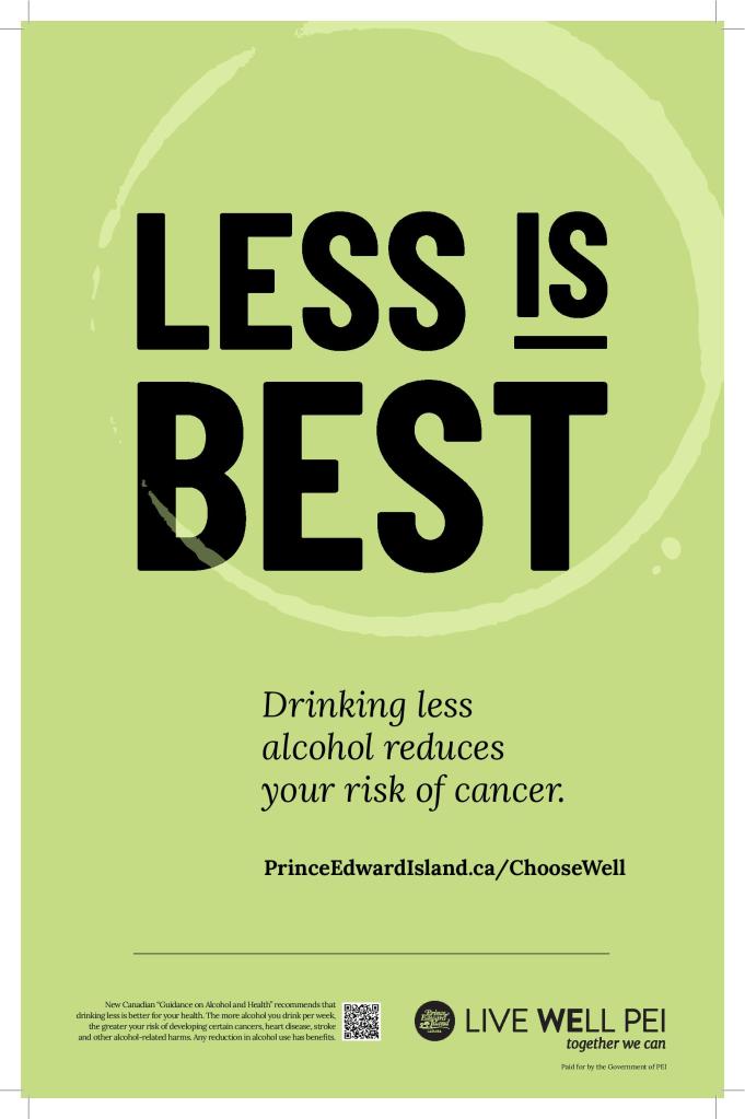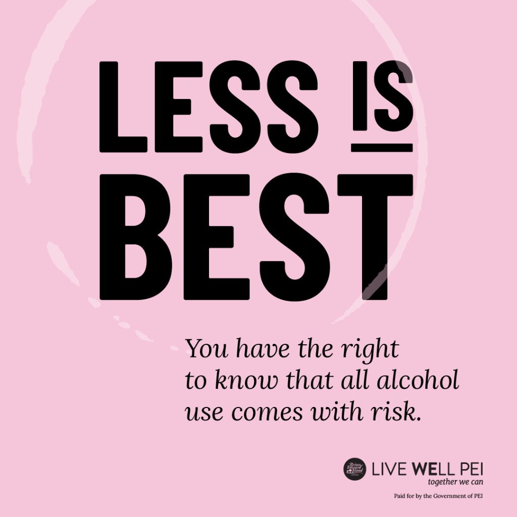 The “Less Is Best” campaign, launched by the Chief Public Health Office in November 2023, encourages Islanders to reflect on their drinking habits and make informed choices. Based on the updated Canadian Guidance on Alcohol and Health, the campaign emphasizes that any reduction in alcohol use can have immediate and long-term health benefits. Through educational materials, including posters and tent cards in public spaces, the campaign fosters awareness and encourages open discussions about alcohol’s risks.