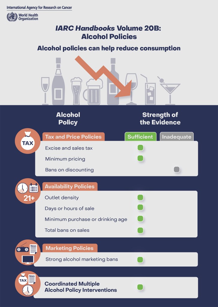 A Working Group of international experts was convened by the International Agency for Research on Cancer (IARC) to review and assess all available evidence on the effectiveness of selected alcohol policies in reducing consumption of alcoholic beverages at the population level. Although alcoholic beverages were classified as carcinogenic to humans (Group 1) several decades ago, no such evaluations had been performed so far.