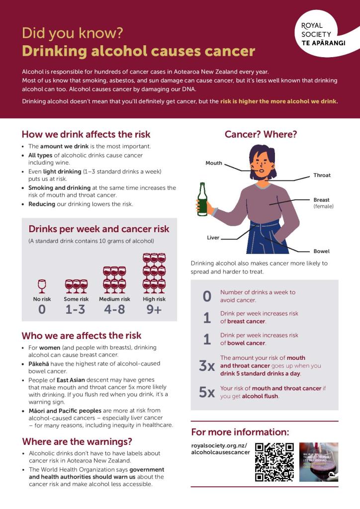 Emeritus Professor Jennie Connor of the University of Otago detailed multiple mechanisms through which alcohol induces cancer. These include causing genetic mutations, facilitating other carcinogens’ entry into cells, disrupting hormonal balances, and promoting metastasis. The factsheet specifically identifies mouth and throat cancer, breast cancer in women, liver cancer, and bowel cancer as directly linked to alcohol consumption.