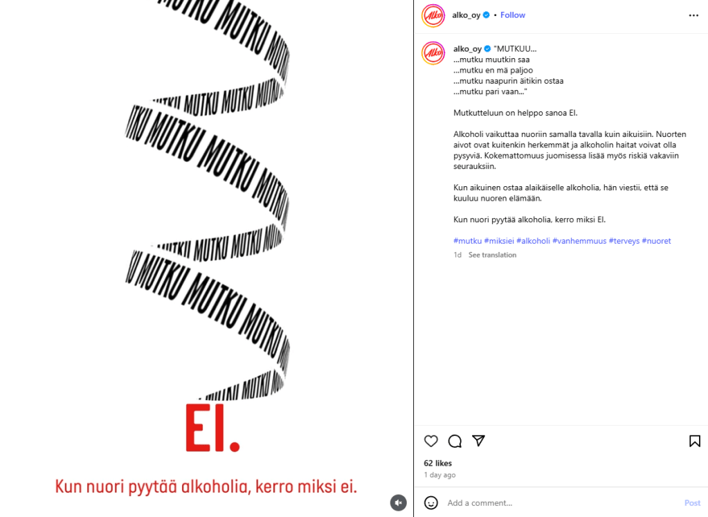 The “Mutku” campaign, which highlights sales control and the risks of supplying alcohol, will be visible in Alko’s communication channels throughout August. The campaign is also carried out in cooperation with influencers (Aamukahvilla, Julia Thurén, Christoffer Strandberg, Kaksi äitiä and Kim Herold).
