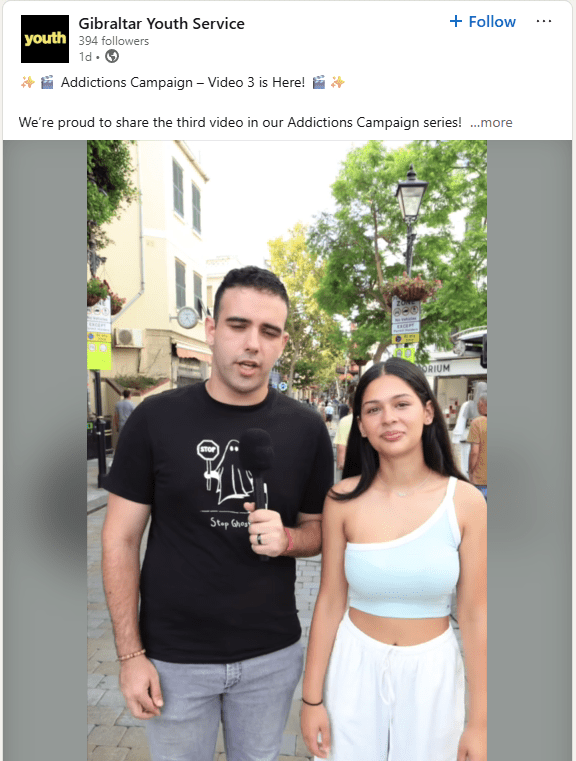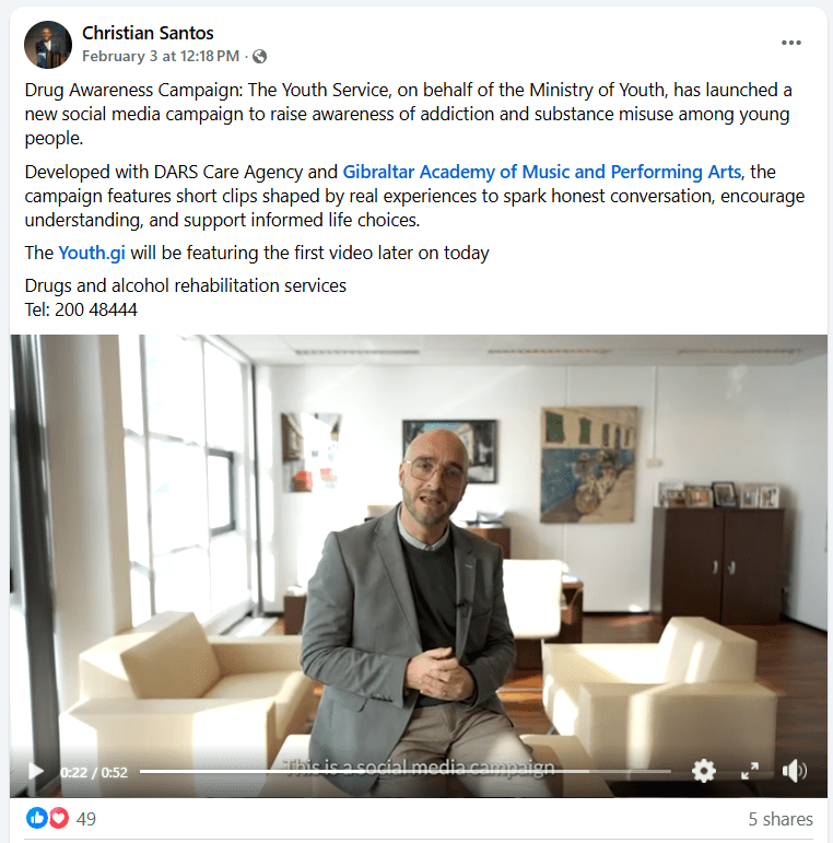 The Youth Service in Gibraltar has launched a new social media campaign focused on addiction and substance misuse among young people, developed in close collaboration with DARS Care Agency and the Gibraltar Academy of Music and Performing Arts. The initiative was shaped following input and encouragement from the Minister for Youth, the Hon Christian Santos GMP MP, in his role as Chair of the Drugs Advisory Council. It reflects a clear message that preventing substance misuse requires cross departmental cooperation and early intervention.