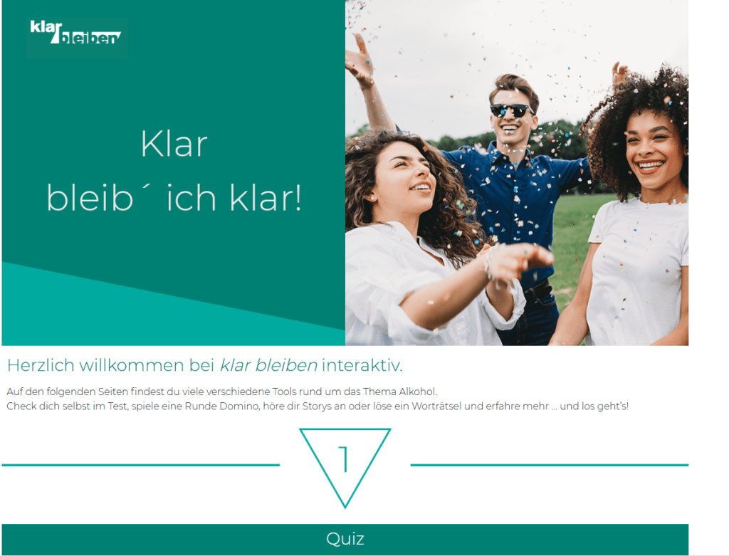The project has been running nationwide since the 2017 to 2018 school year. More than 2,400 classes and around 62,000 young people have taken part, and more than 650 prizes have been awarded. The flyer also notes that klar bleiben is evaluated, has demonstrated positive effects on how young people deal with alcohol, and is included on the recommendation list of the “Grüne Liste Prävention.”